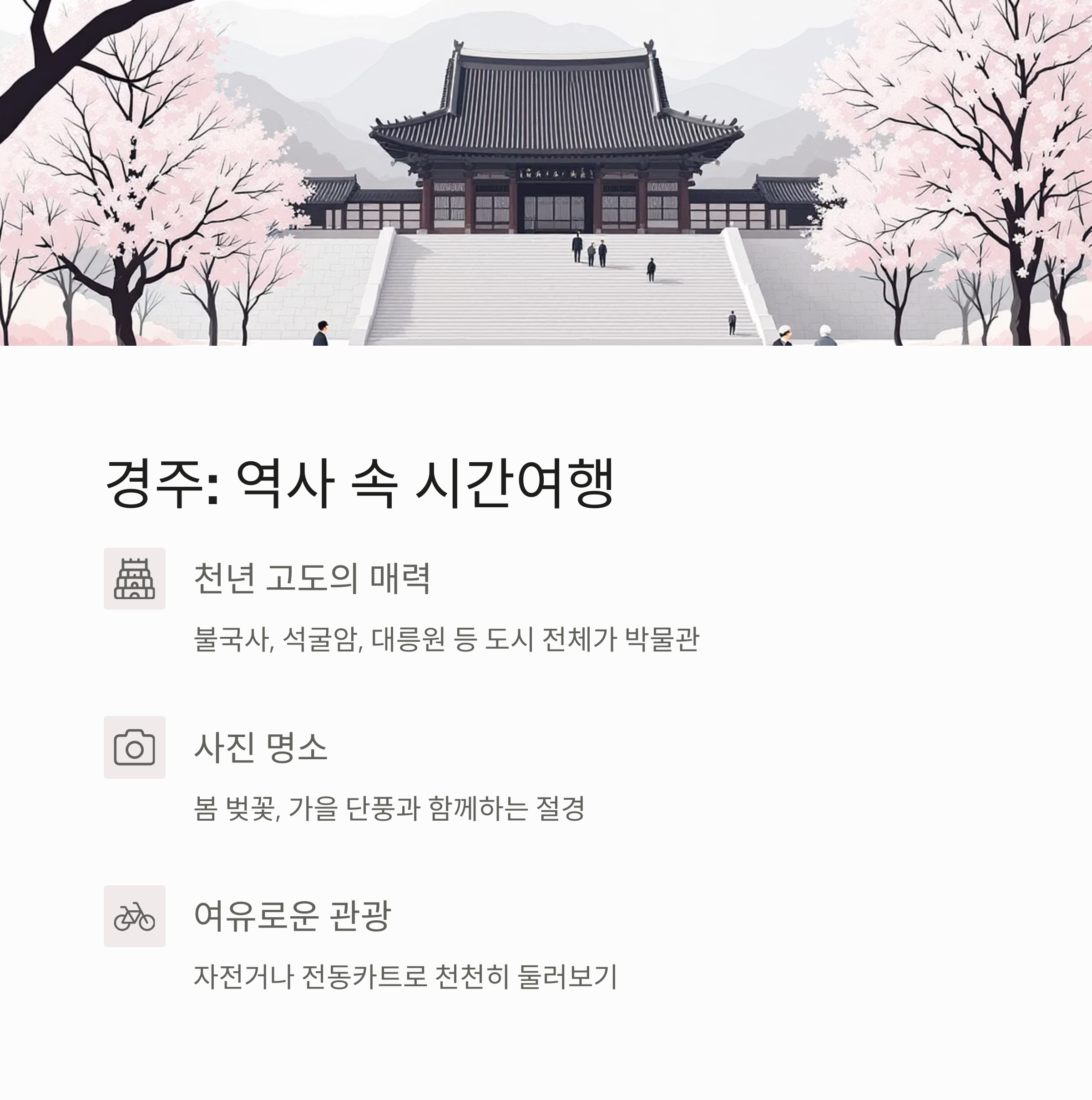 - 주요 명소: 불국사, 첨성대, 동궁과 월지