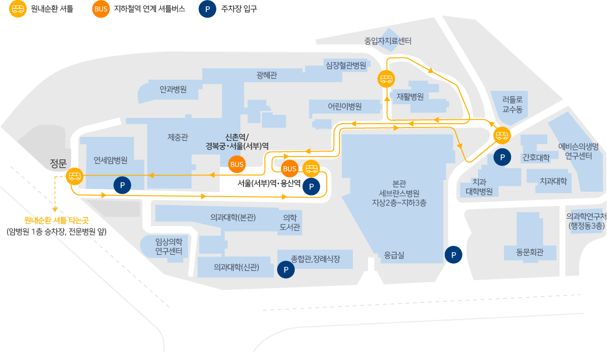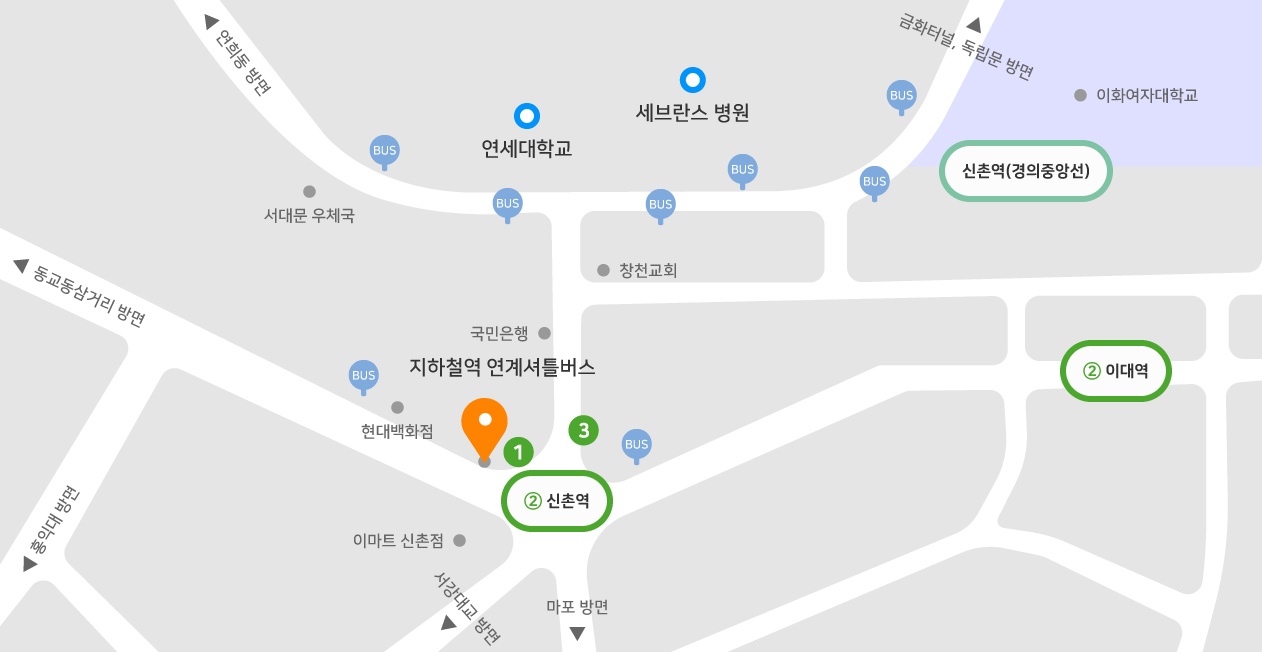 - 2호선 신촌역 1번 출구 → 병원 셔틀버스 / 3번 출구 → 도보 8분