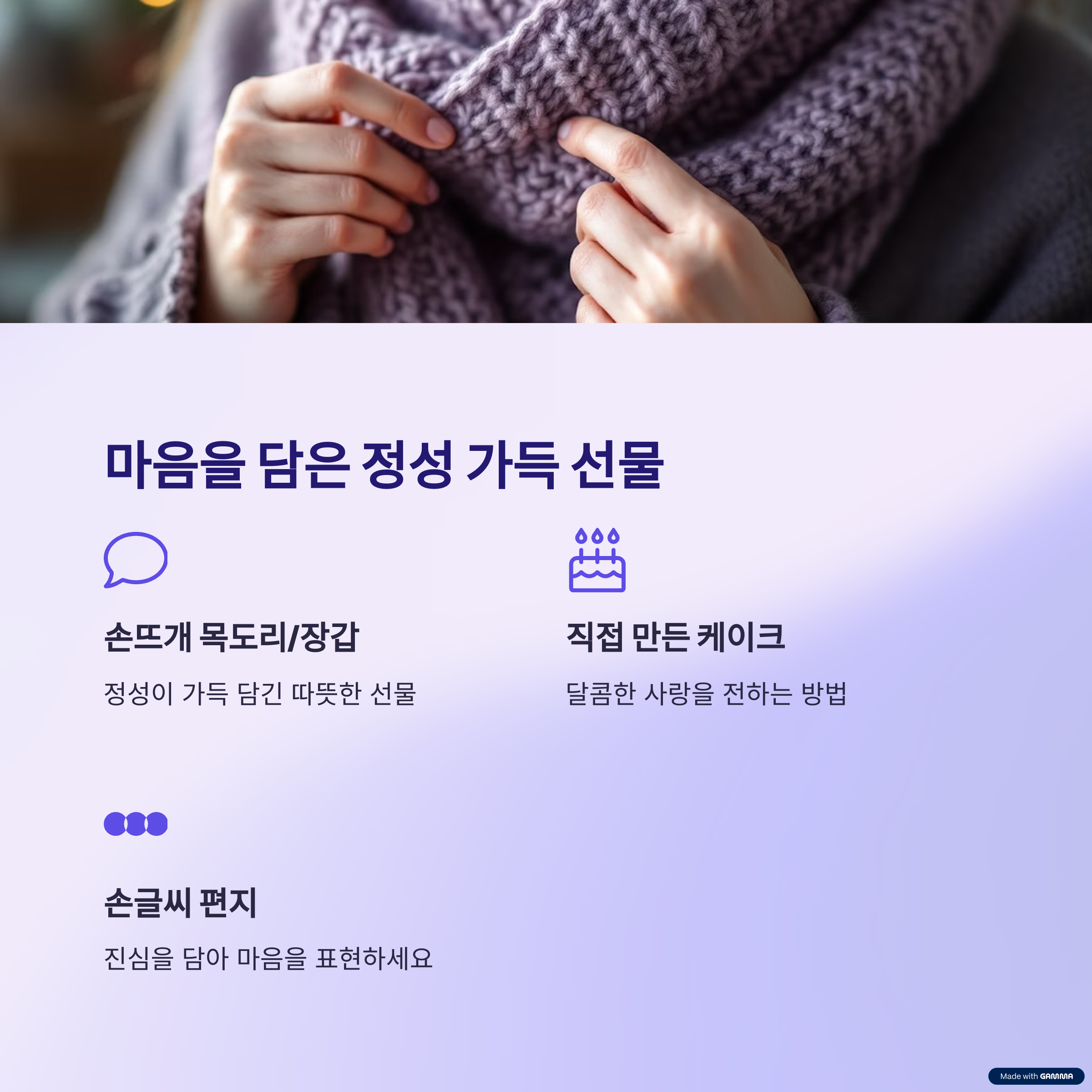 직접 만든 편지, 정성껏 포장한 손수건, 수공예 엽서, 캘리그래피 액자 등
