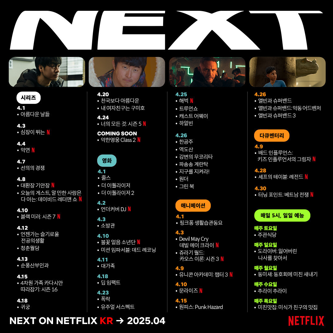 이번 2025년 4월, 넷플릭스에서는 시리즈, 영화, 애니메이션, 다큐멘터리, 예능까지 풍성한 콘텐츠가 준비되어 있습니다. 장르별로 어떤 작품이 언제 공개되는지, 그리고 꼭 봐야 할 추천작은 무엇인지 지금 확인해보세요