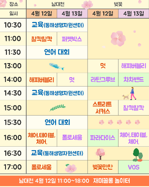 - 남대천 둔치: 2025년 4월 5일(토) ~ 6일(일), 4월 11일(금) ~ 13일(일)